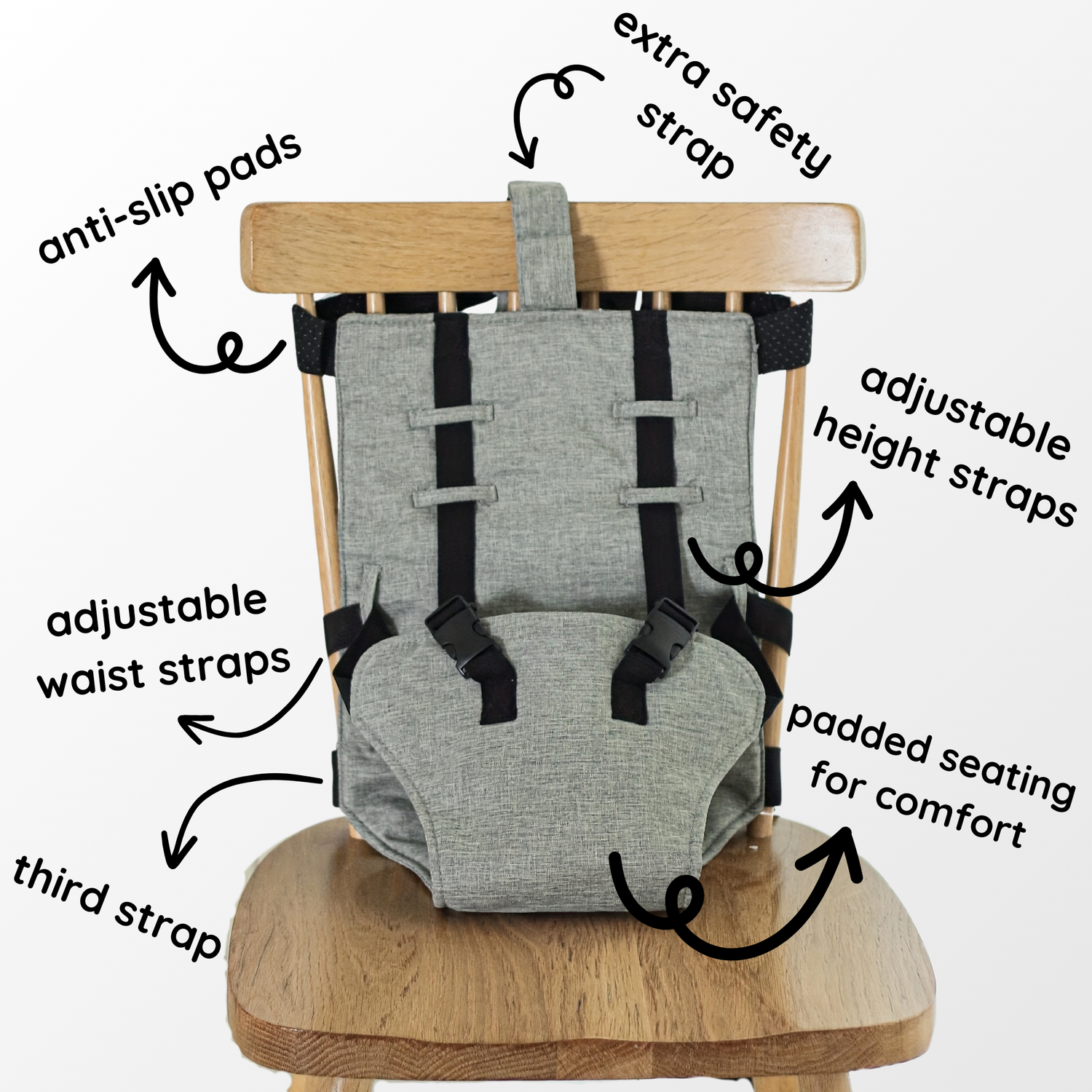 Three adjustable straps ensure compatibility and secure fit with all types of chairs (both tall and wide). Anti-slip pads along the top seat strap, prevent any sliding or shifting on the chair. Additional side loops at the waist provide extra security for smaller babies, ensuring a snug fit at every stage.